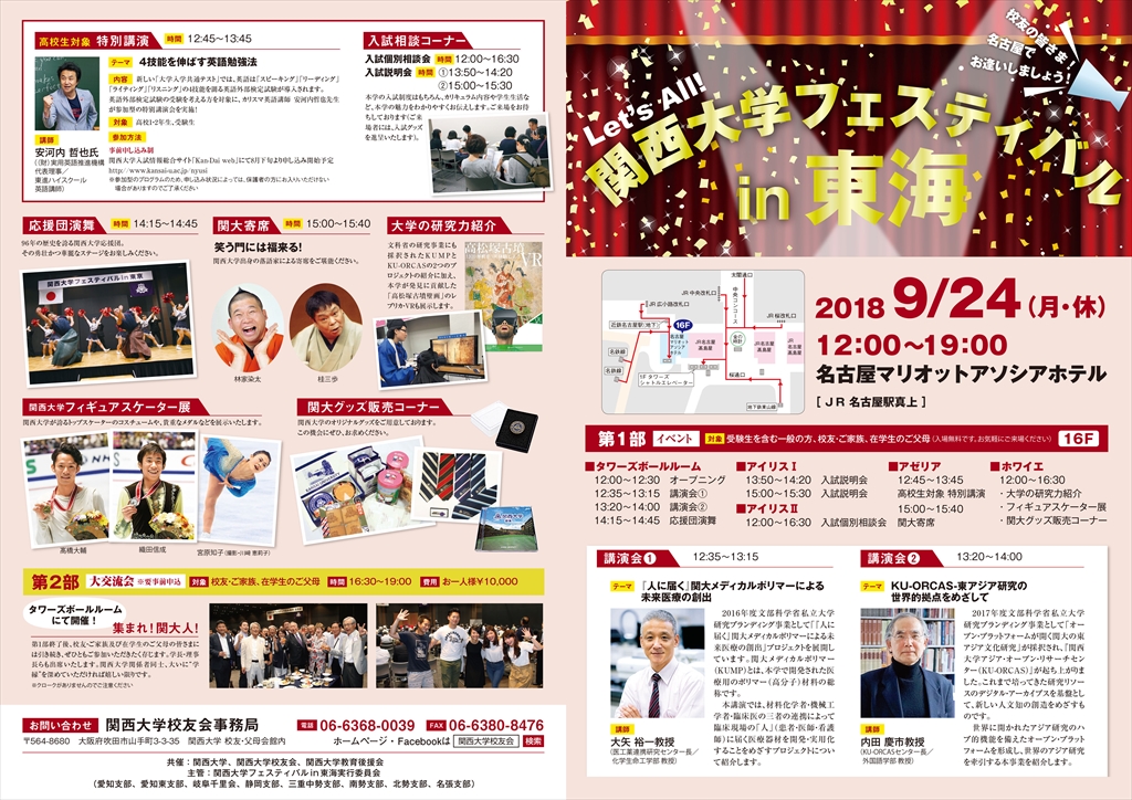 9月24日(月・休)、名古屋マリオットアソシアホテルにて関西大学フェスティバルin東海を開催いたします。詳しくは7月15日発行の機関誌『關大』にてお知らせいたしますが、WebサイトとFacebookページにて、先行して情報を公開させていただきます。