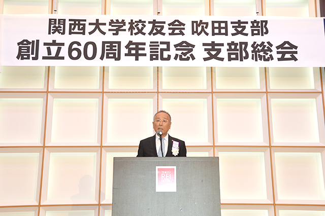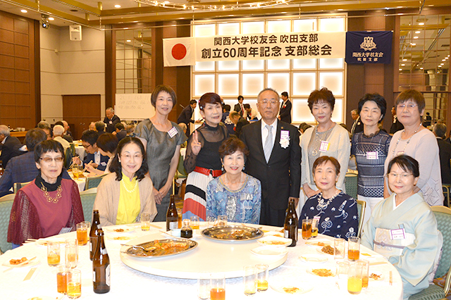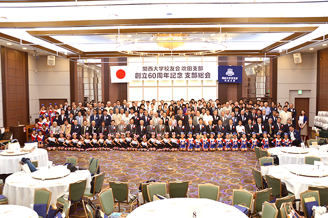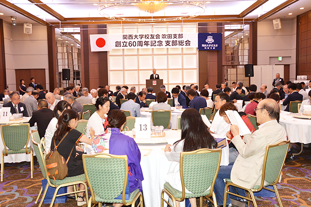 吹田支部(谷康司支部長)30年度総会は、支部創立60周年記念総会として、9月1日に江坂駅前の東急REIホテルで開催され、寺内俊太郎校友会長、北田伸治法人常務理事、芝井敬司学長、後藤圭二吹田市長はじめ、田中義信大阪市内支部連合会会長、近隣各支部の代表など多数の来賓と吹田市役所関大会、会員の155人が出席。賛助出演者を含めると総勢約200人の盛大な記念総会となり、賑やかに佳節を祝福した。