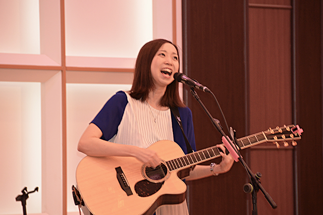 第2部アトラクションでは、開会早々にポンポンを手にした吹田ちびっ子チアダンスチーム「ブルー☆スターズ」が賑やかに入場。テンポの良い音楽に合わせてダンスを披露すると会場のムードは一気にアップした。チアダンスの後は、今年関西大学を卒業したシンガーソングライターの花房真優さんのスペシャルステージがあり、力強くも伸びやかな美声に会場中が酔いしれた。終了後、舞台前、舞台上に全員が集合して記念撮影を行った(写真は総会記念として、後日全員に郵送)。