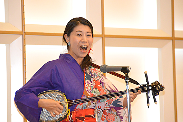 そうこうしているうちに、お待ちかねの支部名物・空くじなしの高級海産物福引抽選会に移った。藤本・土井コンビの絶妙なやりとりで、会場は一気に盛り上がり、9等の高級ウルメ丸干(市価2,000円)から特等の高級海産物6点セット(市価23,500円)まで、当選番号発表の度に歓声が上がった。興奮冷めやらぬ中、藤本真希さんから沖縄民謡の披露があり、中にはテーブルを立って踊りだす会員も見られた。
