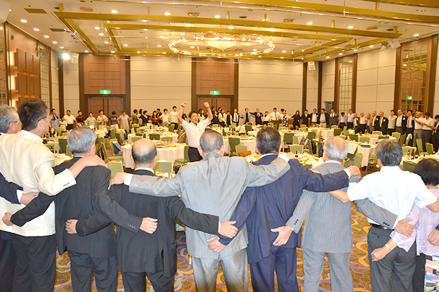 藤田由典応援団第79代団長のリードで逍遙歌を大合唱、吹田市役所関大会・大山達也秘書長の発声で万歳を三唱し、橋本幸治副支部長の閉宴の言葉で、支部創立60周年記念総会は、心地よい余韻を含んでお開きとなった。