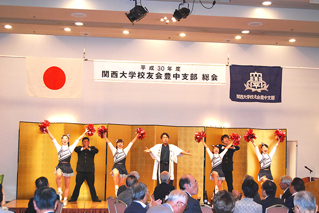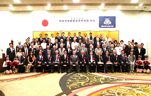 豊中支部(上村学支部長)の30年度総会が、9月22日に千里阪急ホテルで開催された。当日は、大学から矢野常務理事、芝井学長、校友会から田中副会長、4月に当選した長内豊中市長をはじめ、近隣支部の支部長・役員を来賓に迎え、同伴者を含めて80人の参加となった。