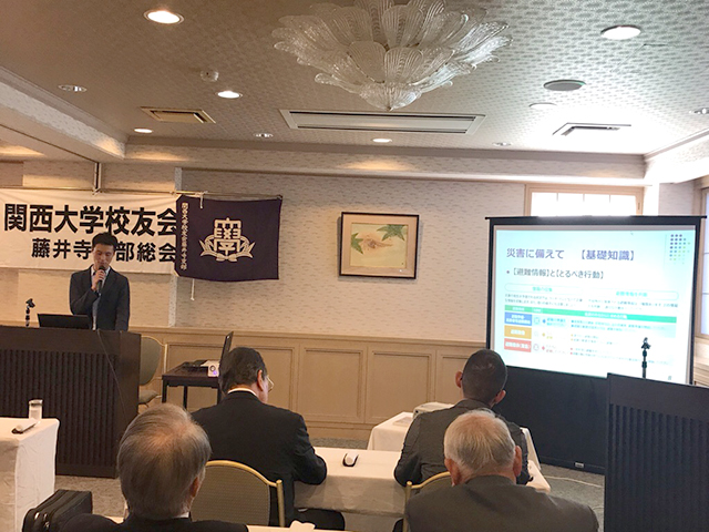 午後4時からの第1部は、藤井寺市役所危機管理室の協力により、吉田講師から「災害・防災」をテーマに講演があった。パワーポイント、DVDを使った講習形式で、出席者は身近に危機意識をもち熱心に聞き入っていた。