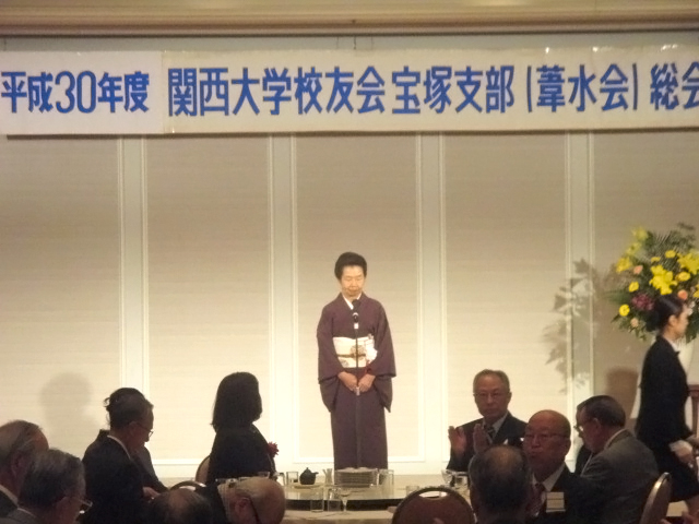 10月20日に宝塚ホテルで、宝塚支部(葦水会 門田安正支部長)の30年度総会・懇親会が、校友会本部、近隣支部役員、その他関係団体の方々と支部会員を合わせ、総勢69人の出席で盛大に開催されました。