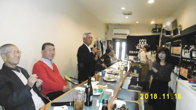 最初に全員で学歌斉唱し、松浪啓一副顧問挨拶に続き、晒功大先輩の乾杯の音頭で開会した。