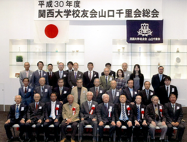 山口千里会(藤井宏紀会長)30年度総会は、11月3日に例年どおりJR新山口駅前の山口グランドホテルで、本部の田中義昭副会長はじめ、近隣支部から福岡千里会白木成光会長、広島支部岡本直久副支部長、山下慶高幹事、北九州支部大石義雄副支部長にもご出席いただき校友26人、ご来賓6人の出席のもとに開催されました。