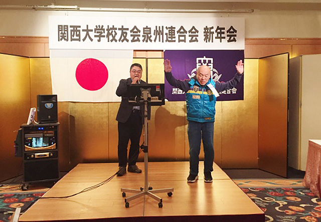最後の逍遙歌は、応援団OBの亀岡政司会員のリードで、母校関大への想いを馳せ、肩を組んでの大合唱。松浪副会長の閉会の辞で散会となった。