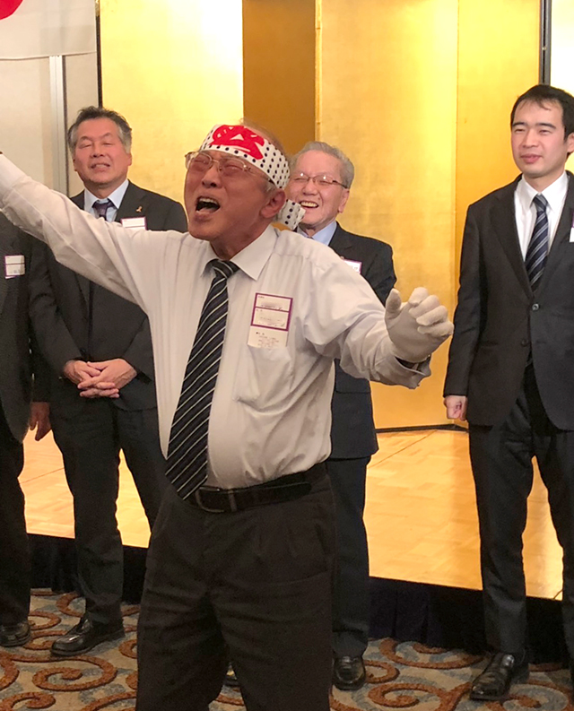 続いて、守口支部恒例の「逍遙歌」を伊勢副支部長のリードに合わせ、円陣を組み合唱しました。最後に、伊藤副支部長の閉会の挨拶で和気あいあいとした新年互礼会もお開きとなりました。