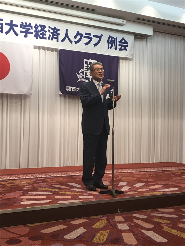 経済人クラブ(生田圭一会長)第222回例会が、大阪新阪急ホテルで開催された。出席は来賓3人、新入会員2人、ゲスト2人を含め総勢51人だった。学歌斉唱で開会し、生田会長の挨拶の後、第1部で総会を開催し、その後、第2部で講演に移った。