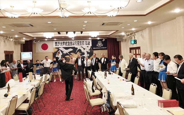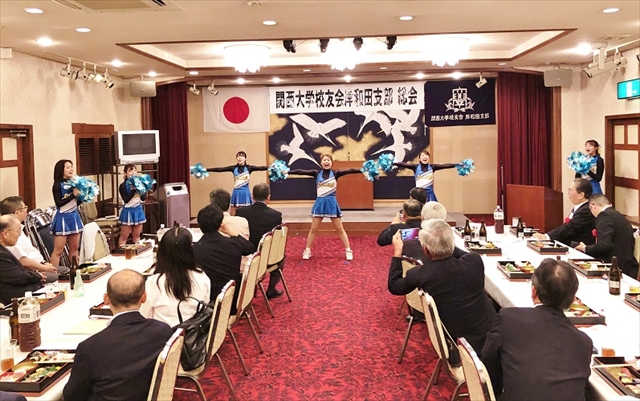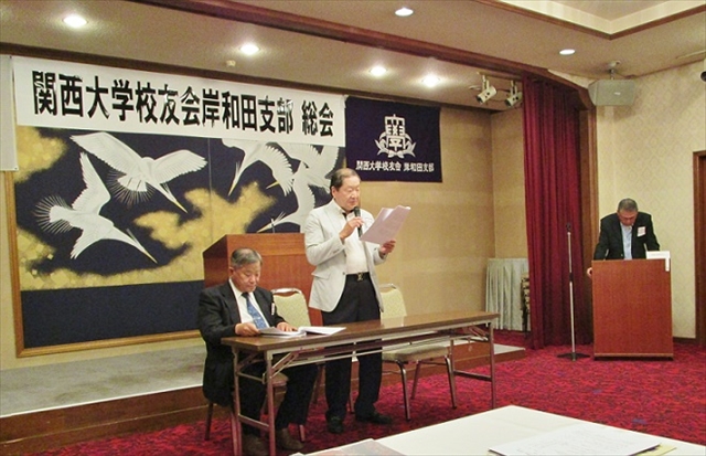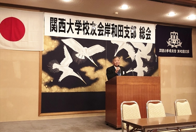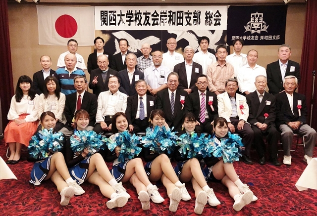 第2回総会は、関大クレアーズの出迎えで華やかな総会となった。本部より中井邦夫副会長、奥田恵造事務局課長はじめ、近隣支部より3人、そして、永野耕平岸和田市長を来賓に迎え開催した。