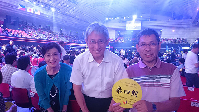 令和元年7月12日、府立体育館でボクシング部OBの拳四朗君の6度目の防衛戦です。西宮支部から三木允子支部長、石原美之副支部長、中井光がアリーナ席から、また小坂道一・海蔵寺浩両顧問をはじめ池内理事長らがリングサイドから応援です。またボクシング部OBの梅本博司幹事は、入退場時に関西大学ののぼりを掲げて場を盛り上げられています。