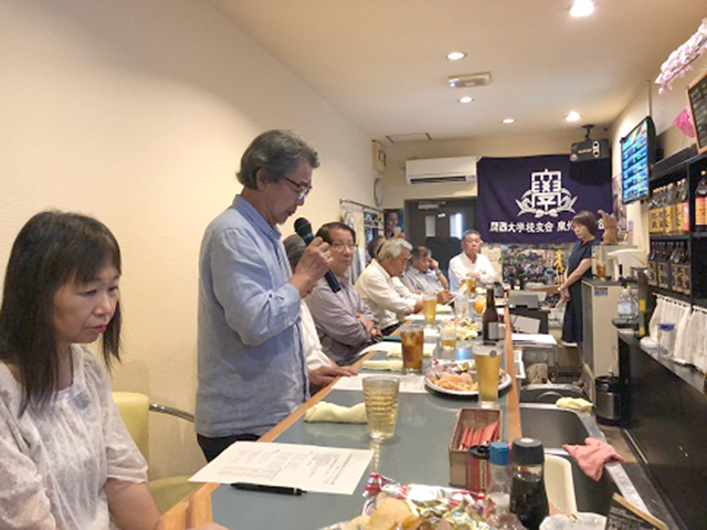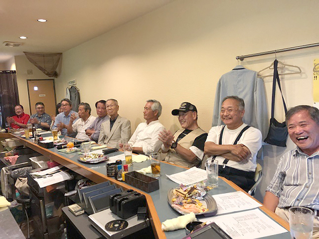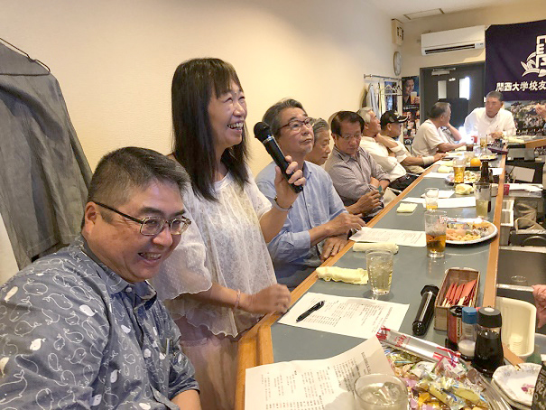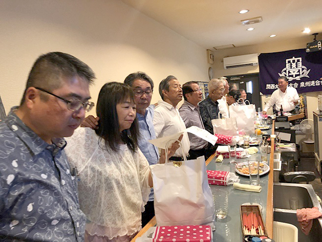 7月初旬に吉田常佳顧問(連合会会長)が急逝されたので、全員でご冥福をお祈りし、黙祷を捧げた。岡本俊彦貝塚支部長に献杯の発声を頂いて、開会。吉田顧問におかれては、連合会「カラオケ友の会」の推進者であり、全員心のこもった歌を、各3曲歌い追悼。そして全員のスピーチで、吉田顧問を偲んだ。今回も満席のカウンター、相変わらずの熱唱。ほどよい酔いの中、吉田顧問を偲んだ。