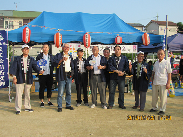 昨年は、あいにくの台風で納涼祭は中止となったが今年は大成功を、と地元自治会が中心となって開催された。川西支部も地域や社会に貢献することをめざし、併せて支部校友の増強や掘り起しを図る機会として取り組んだ。