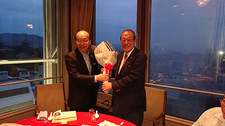 奈良県関大倶楽部奈良県関大倶楽部役員会 出口顧問の連続当選を祝す 2019年08月28日 奈良県関大倶楽部の役員会を開催。創立当初よりご尽力を賜っている出口武男顧問の「県議会11期連続当選」を祝して、松谷会長から花束が贈呈された。 連続当選は奈良県政始まって以来の快挙。出口顧問は42歳で初当選、議長を2期歴任され、今も重鎮として県政を牽引されている。顧問から、今後の倶楽部活動に期待するお言葉をいただいた。