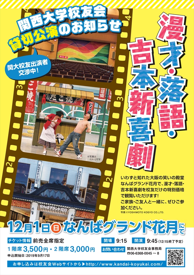 12/1なんばグランド花月貸切公演開催 2019年09月24日 いわずと知れた大阪の笑いの殿堂なんばグランド花月で、漫才・落語・吉本新喜劇を校友だけの特別価格で観覧いただけます!ご家族・ご友人と一緒に、ぜひご参加ください。 <公演日> 12月1日(日) 開場9:15 開演9:45 <申込締切日> 10月18日(金) <会場> なんばグランド花月 <チケット情報> 1階席3,500円・2階席3,000円 満席のため、申込受付を終了いたしました