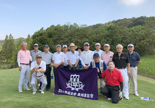 9月11日、学歌流れるパター練習グリーンにメンバー全員集合。泉州連合会第12回ゴルフコンペが、泉佐野カントリークラブで開催された。