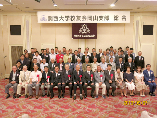岡山支部第63回岡山支部総会 初参加者12人でフレッシュに 2019年09月07日 第63回岡山支部総会をピュアリティまきびで開催。芝井敬司学長、安部善博常務理事、広島支部岡本支部長、備後支部平櫛支部長・加納代表幹事、香川支部田井副支部長をご来賓として、総勢62人に参加いただきました。 また、初参加者が近年最多となる12人で、とてもフレッシュな総会となりました。初参加者への質問タイム、お楽しみ抽選会や当日のゴルフ大会の成績発表等で大いに交流を深めました。 来年の第64回令和2年(2020年)総会は、9月5日(土)です。校友の皆さまぜひご参加下さい。 (小林浩一)