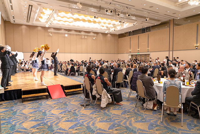 懇親会では、応援団による演舞演奏が始まると大いに盛り上がり、逍遥歌大合唱で会場が一体感に包まれた後、閉幕した。