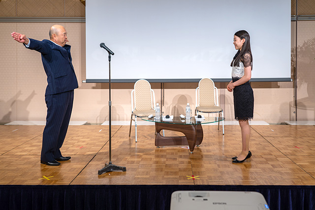総会の後、関西大学カイザーズフィギュアスケートクラブ所属の紀平梨花氏をゲストに迎え、トークセッションが催された。紀平選手の魅力溢れるトークに参加者全員が魅了され、関西大学元応援団長の田中支部長から紀平選手の今後の益々の活躍を祈念して力強いエールが贈られた。