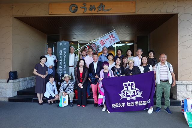 社会学部同窓会(中尾会長)は、9月23日に、大阪駅に集合して、貸切バスで淡路島に出発した。心配された天気であったけれど、嘘のように晴れ渡るなか、明石海峡大橋を渡り、第一の目的地である人気の「うめ丸」に到着。