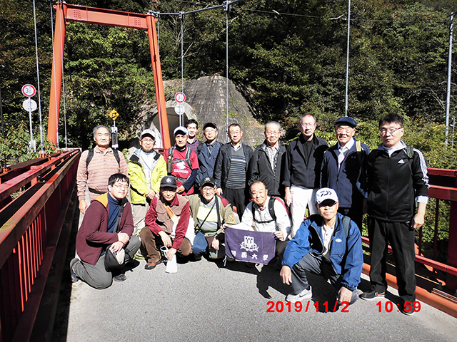 絶好の晴天の中行われた第28回歩こう会。JR川西池田駅を出発した一行はJR宝塚線・武田尾駅を降り、目前の武庫川に沿って走る「旧国鉄山陰線・廃線跡」を歩いた。約10年前も歩いたが、当時はみな若く元気で、2駅前の「生瀬駅」から歩いたものだったが今回はその時の距離も時間も半分の約4km、1時間のコースであった。ただ枕木やトンネルは山陰線の時のままであった。