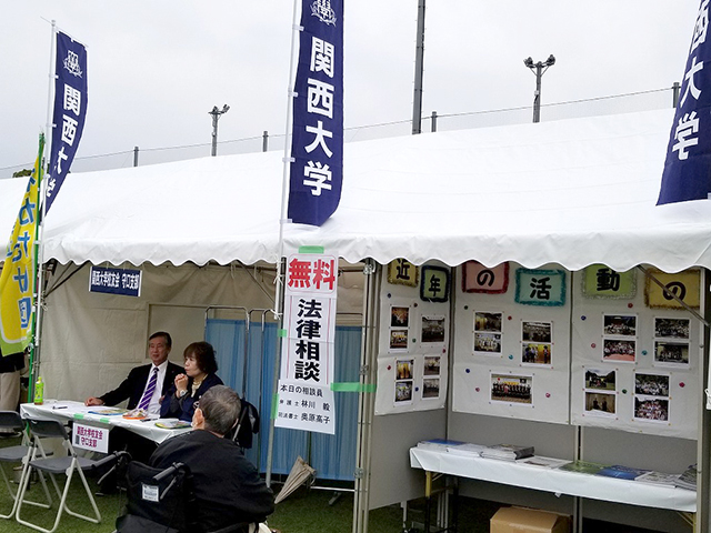 校友会守口支部(川部政彦支部長)では、一昨年からテントブースを出店し、支部会員の林川毅弁護士・奥原高子司法書士がボランティアで無料法律相談を行うとともに、冊子や写真で大学及び校友会活動のPRを行ってきております。