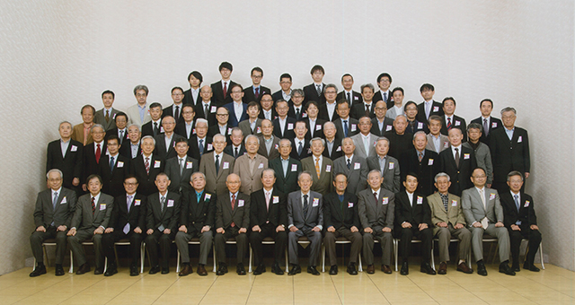記念会は物故会員への黙祷、学歌斉唱に始まり、林義夫会長(昭和42年卒)の活動隆盛に向けた力強いご挨拶。そして下間先生や機友会初代会長の長友康夫氏(昭和37年卒)による、学科開設当時の学生生活の懐古談に花が咲いた。