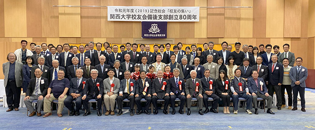 支部創立80周年を迎えた備後支部は、11月2日に福山ニュ-キャッスルホテルにおいて、校友会本部から寺内俊太郎校友会長、森茂実事務局長をはじめ広島支部、山口千里会、岡山支部及び関西学院同窓会広島県東部支部から合わせて10人のご臨席を賜り、母校応援団チア9人も駆け付け総勢88人が記念の支部総会を開催しました。