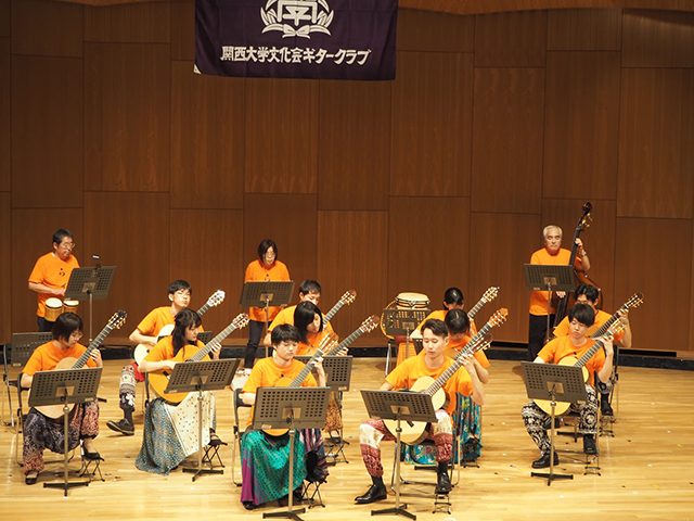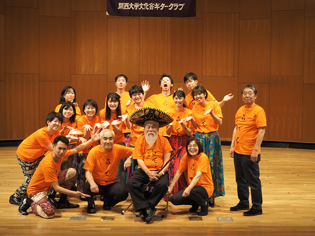ギタークラブOB会第57回定期演奏会創部60周年を記念しOBとラテンアンサンブル 2019年11月17日 11月17日、伊丹アイフォニックホールで関西大学文化会ギタークラブ主催「第57回定期演奏会」が開催された。今年で創部60周年を迎えたことで、記念ステージとしてOBとラテンアンサンブルを行った。58期と4、6期のOBと共演した。