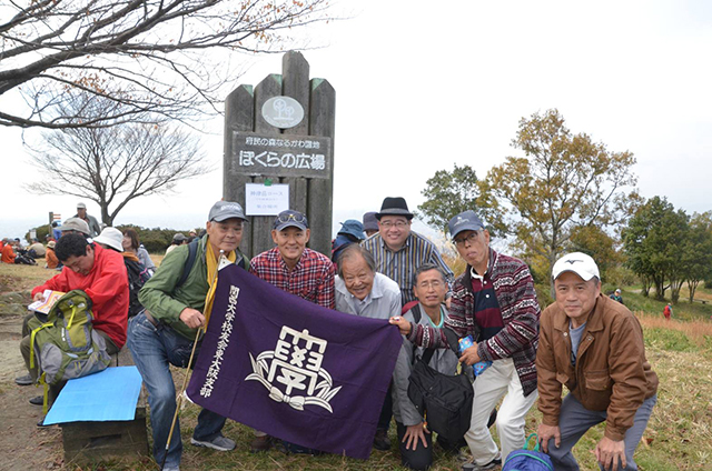 大阪平野を一望できる「僕らの広場」では、当支部校友がケーブルテレビJ-COMのスタッフから取材をうけ、支部旗を広げながらインタービューに応じました(※2)。昼食後は解散。各自各コースで下山となり、当支部有志数名はかなりきつい下山道をゆっくり下って15時過ぎに瓢箪山駅でお茶会となりました。また来年もっと多くの有志の方々と参加したいと思います。