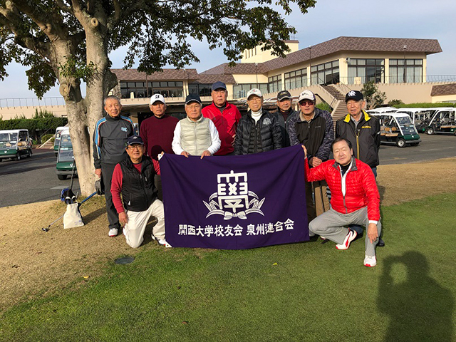 12月11日、学歌流れるグリーンにメンバー全員集合。泉州連合会第13回ゴルフコンペが、岸和田カントリー倶楽部で開催された。