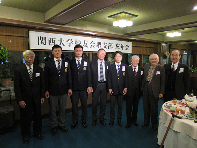 堺支部忘年会に45人参加 野球部早瀬監督と学生招く 2019年12月06日 令和元年の忘年会は、12月6日南海グリルにて、45人の出席で開催された。明治神宮野球大会にて準優勝を成し遂げた早瀬万豊監督と選手の代表3人をお招きした。堺支部からお祝い金を贈呈。早瀬監督から野球部の近況報告を拝聴した。また、司会者から選手それぞれにインタビューを行った。 終わりに出席者全員が肩を組み、「逍遥歌」を高唱し、閉会した。 (秦 寛宜)