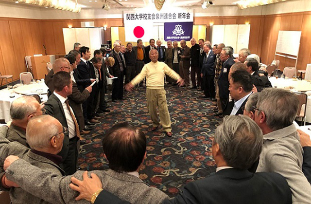 最後の逍遙歌は応援団OBの亀岡政司高石支部幹事にリードしていただき、母校関大への想いを馳せ、肩を組んでの大合唱。岡本俊彦貝塚支部長の万歳三唱で、散会となった。