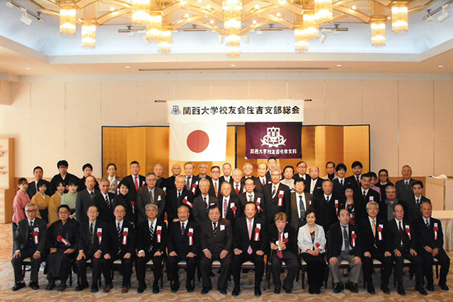 1月13日成人の日、住吉大社で支部総会と新年互例会を開催。来賓は寺内俊太郎校友会長、大阪市内支部連合田中義信会長、森茂実校友会事務局長ほか、近隣支部長や幹部の方々。さらに篠山支部からは中瀬支部長をはじめ、4人もの幹部の皆さんにもご出席いただいた。合計34人もの来賓に恵まれ、嬉しい限り。住吉支部会員は新入会員2人と賛助会員を含め30人、今後も新入会員獲得のため、支部一丸となって取り組みたい。
