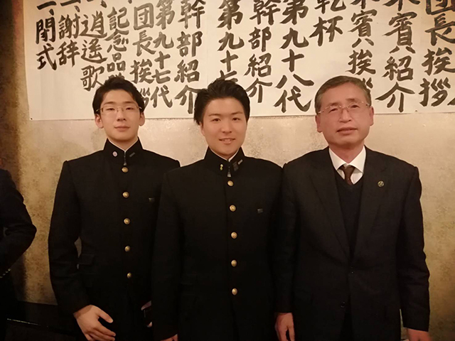 東大阪支部応援団第97代幹部送別会および 新幹部披露式に出席 2020年02月23日 2月23日(日)に千日前の「味園」で開催され、当支部から田村支部長と堤下総務部長が出席。応援団OB、体育会OBや高槻島本支部、芦屋支部の方々とも交流できました。写真は第98代森岡団長、林副団長と田村支部長です。 (総務部長 堤下 浩一)