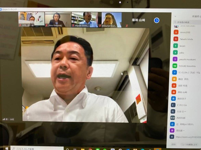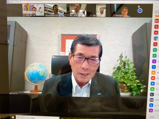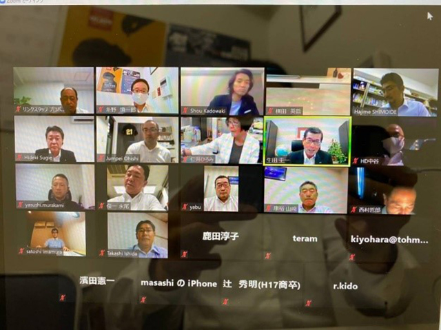 昨今のコロナウイルス感染拡大防止に配慮し、オンライン会議アプリのZOOMを活用して開催しました。参加者は「ミーティングスペース」にアクセスし始め、最終的には30人ほどが繋がりました。18時、楠副代表幹事の司会進行により開会。学歌斉唱の後、生田会長のご挨拶。WEB例会開催となった趣旨のご説明をいただきました。