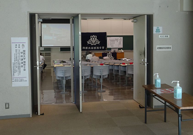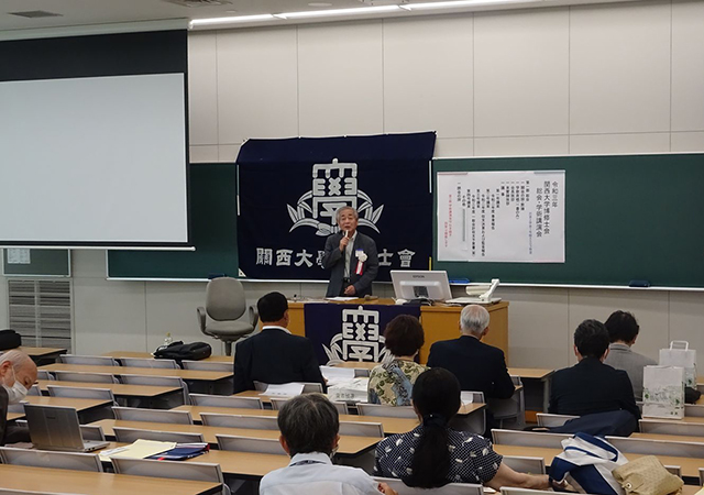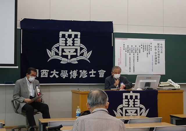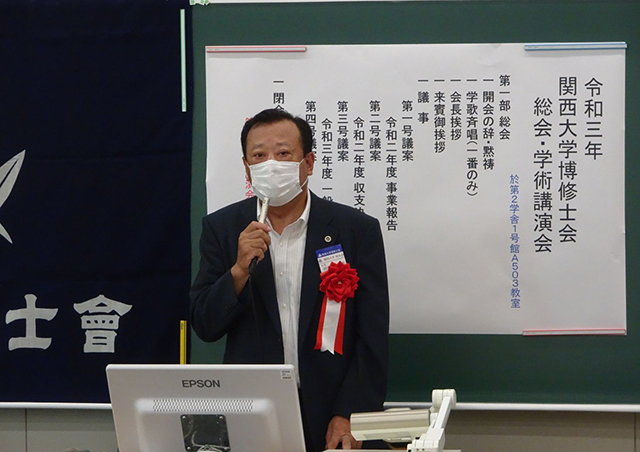 本年度の総会・学術講演会もコロナ禍での開催、感染予防とソーシャル・ディスタンシングを徹底した。芝井敬司理事長、前田裕学長、田中義信校友会会長、藤田髙夫副学長、山本秀樹副学長、小谷寛子女子秀麗会会長に、来賓として出席いただいた。