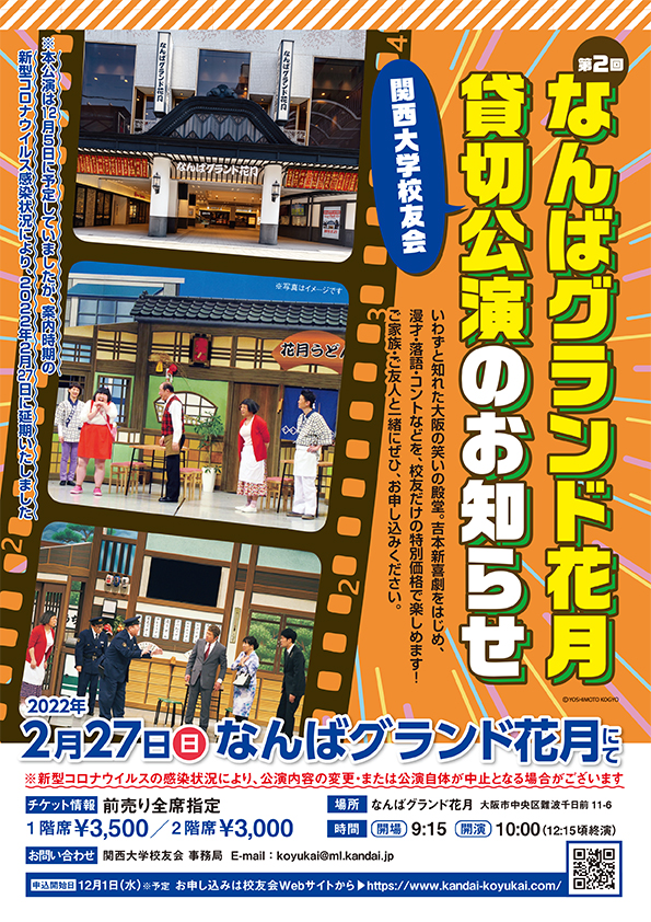 いわずと知れた大阪の笑いの殿堂なんばグランド花月で、漫才・落語・吉本新喜劇を校友だけの特別価格で観覧いただけます!ご家族・ご友人と一緒に、ぜひご参加ください。