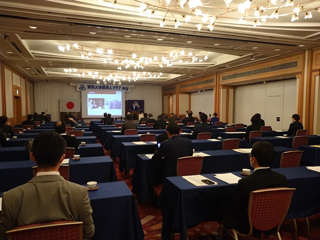 2月7日に、第231回と同様に大阪新阪急ホテルの会場とZoomを利用したハイブリッド方式で開催。ゲストのほか、東京経済人倶楽部もリモートでご参加くださいました。糸野幹事の司会進行により開会、学歌斉唱、永尾会長の挨拶の後、来賓を代表して芝井敬司理事長、Zoomより田中義信校友会会長からご挨拶を、IDEC株式会社代表取締役の船木俊之様より、講演をいただきました。