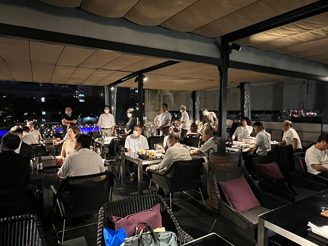 講演会終了後、中之島ラブセントラルバーベキューテラスにて懇親会を開催。ご来賓の前田裕学長からご挨拶を、池内啓三前理事長には乾杯のご発声をいただいてスタート。参加者の皆さまには一言ずつちょうだいし、終始和やかに大変盛り上がりました。暑気払いとして屋外でのバーベキューでしたが、川沿いということもあり気候も穏やかで、最後まで気持ちよく楽しめました。