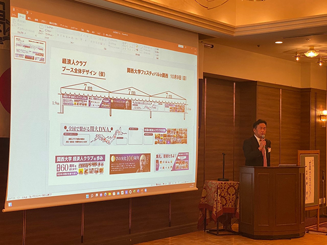 9月12日に、大阪新阪急ホテルにて開催された。第1部は学歌斉唱の後、永尾会長の挨拶。10月9.10日千里山キャンパスで開催される『関西大学フェスティバルin関西』について、経済人クラブブースの説明があった。全長21mにも及ぶ超大型ブースには東京、中部、東北、各経済人クラブブースが設けられ、若手ブースや過去のあゆみブースなど、盛り沢山の内容で出店する。企画構成は若手メンバーが中心に作成、期待が高まる発表だった。