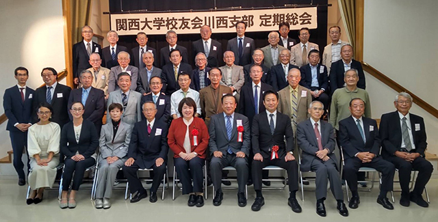 秋晴れのなか、今年度の定期総会が川西市商工会館で盛大に行われた。コロナ禍でもあり、支部校友中心の総会だったが、来賓4人を含め40人を越える参加者が集った。近年にない参加者数である。支部長はじめ、校友の思いが積もった総会であった。