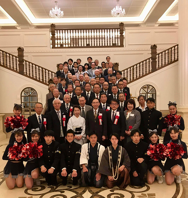 令和4年度宝塚支部総会・懇親会を令和2年6月にオープンした宝塚ホテルで開催。来賓19人、現役学生4人を含め、65人が参加。第一部総会では役員改選となり、新役員が決定した。第二部は、田中義昭校友会副会長に「学歌百年史」を講演いただいた。第三部の懇親会では、3年ぶりに旧交を温めることができた。また、今回は商学部の学生3人を招待して、ゼミ活動の報告をしてもらった。OB、OGにはとてもよい交流であると喜ばれ、現役学生には、卒業後も繋がることを知ってもらえる機会となった。応援団にも演舞を披露していただき、コロナ禍でも凹むことなくガンバル気力をもらい、和気藹々に閉会した。