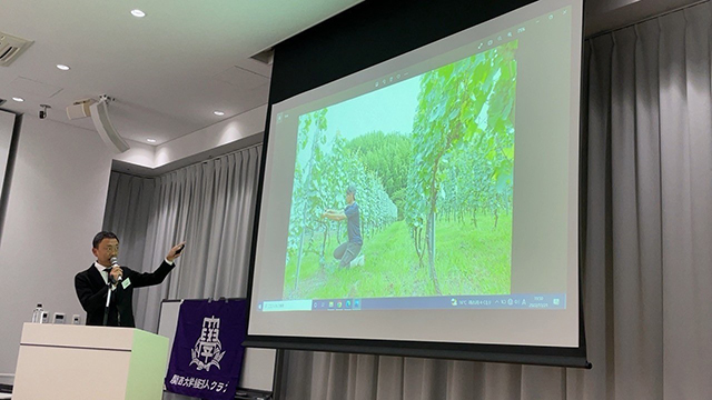 第2部「経済人のためのワインセミナー」では、当クラブ会員でもある(株)河内ワイン代表取締役の金銅重行様より「河内ワイン90年の歴史と和飲(ワイン)セミナー」と題し、同社の歴史と経営に関する講演及び河内ワインのテイスティング会が行われた。講演では、ぶどう農家であった同社がワインづくりを始める契機となった社会環境の変化や当時の経営者の決断について詳細な説明があった。また、ワインの製造工程や余ったワインをブランデー・梅酒に加工するまでの工夫、それらを取り巻く地域住民との関わりなどがユーモアあふれる軽妙な語り口で語られた。講演後は、会員と学生が意見交換しながら河内ワインのテイスティングが行われ、新入会員やゲスト参加者の紹介が行われた。
