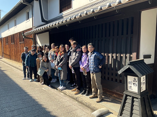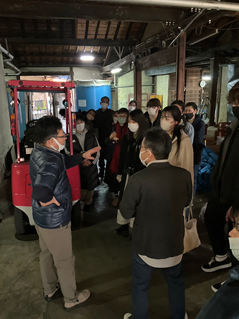 校友会では2023年度活動方針のひとつに、留学生との交流推進を掲げています。校友会河内長野支部では関西大学国際部や河内長野市の協力の下に、留学生を招いて河内長野駅近くで校友が経営する「天野酒」の酒蔵見学を行いました。7つの国・地域からの留学生13名は、校友の桝井繁春河内長野市副市長や英語通訳を担当する支部校友らの出迎えを受けて藤田高夫副学長(国際部長)と酒蔵に入り、仕込みタンクで膠が活発に発酵している様子など、日本酒の製造工程を蔵主の西條陽三副支部長の案内で見学しました。