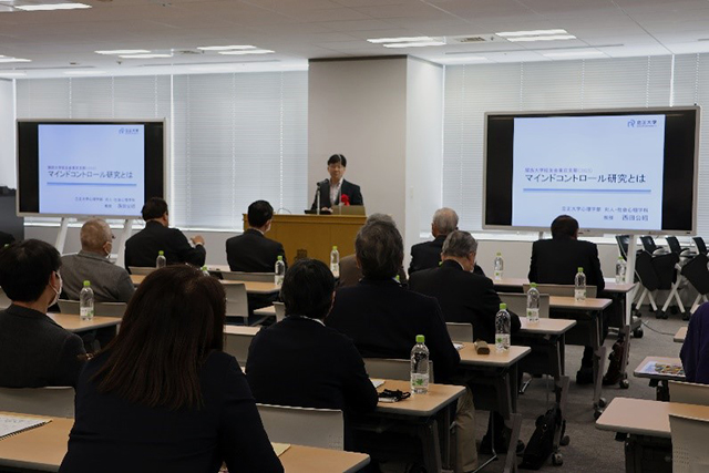 特別講演では、立正大学心理学部対人・社会心理学科教授の西田公昭様(昭59社)をお招きし、『マインド・コントロール研究』というテーマで、どういう状況でどういう方法でマインド・コントロールされるのかなどの具体的なお話があった。西田先生は「消費者庁霊感商法等の悪質商法への対策検討会」の委員もされている。直近の話題ということもあり、皆さんは非常に興味深く聴講された。