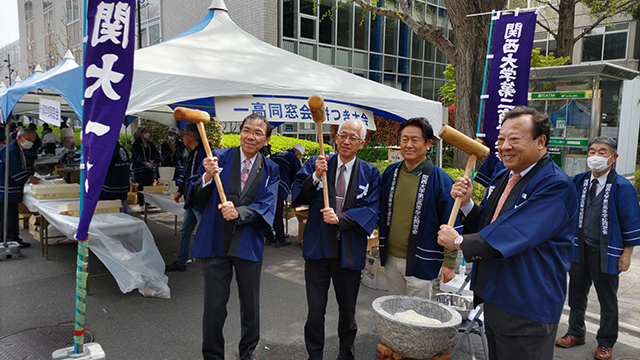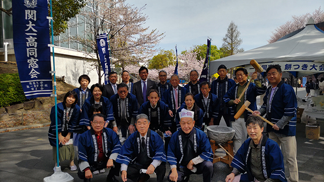 第一高等学校同窓会校友会ホームカミングデー ~2023スプリングフェスティバル~に出店 2023年04月02日 この度の「校友会ホームカミングデー~2023スプリングフェスティバル~」に出店しました。満開の桜と美しい青空の下、恒例の一高同窓会「お餅つきとぜんざいのお振る舞い」を行いました。最初に、芝井敬司理事長・前田裕学長・田中義信校友会長の餅つき、その後、約600人にお餅を振る舞い、また、ぜんざいも約700人にご賞味いただきました。 当日は、一高教育後援会をはじめ、同窓会の多数の方々にも応援やお声掛けをいただいたことを心から感謝申し上げます。