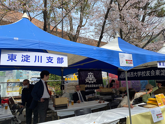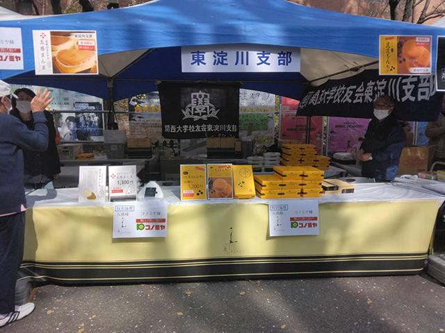 東淀川支部(田中康二支部長)は、ホームカミングデーで恒例のブースを出店。「ええもん東淀川」と名付け、会員の『五感』『プチ プランス』の浅田美明社長にご協力をいただいて、お菓子販売を行った。また、同じく会員の『コノミヤ』の芋縄隆史社長からは、お茶などの飲物をたくさん協賛いただいた。会員がお茶とお菓子で校友をもてなし、校友に声を掛けてくれた東淀川区在住の新入学生も飛び入り参加し、大いに盛り上がり歓談した。
