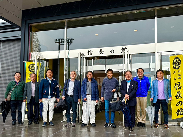 会計人会では、会員相互の親睦を図るため毎年日帰り旅行を実施しています。この2年間は新型コロナウイルス感染症拡大に伴い中止しましたが、今回で4回目、4月7日に古渕会長をはじめ9人で近江八幡へ行きました。一日中あいにくの雨でしたが人気観光スポットにもかかわらず、混雑することなくゆったりと楽しめました。近江八幡駅に集合し、2台の車で移動。八幡堀内を航行する八幡堀めぐりを体験しました。散った桜の花びらが川に流れる景色は、とても風情があり印象的でした。その後、八幡山ロープウェーで山麓と山頂を往復し、山頂では町の景色と琵琶湖を見渡しました。昼食は「たねや日牟證茶屋」で郷土料理をいただきました。シックな店内で落ち着いて食事ができました。トマトゼリーなど初めて食べる料理も多いなか、特に近江牛ステーキがとてもやわらかくおいしかったです。昼食後は、安土城考古博物館と安士城天主信長の館へ。当時を再現したシアター映像もあり、楽しく歴史の勉強もできさらに興味深く展示品を見て回ることができました。本当に充実した一日を過ごせたと思います。来年以降は、さらに多くの方に参加していただきたいものです。