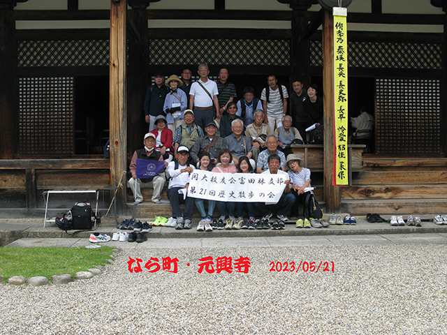 富田林支部(森岡愼治支部長)歴史散歩の会では第21回を実施し、校友家族も含めて24人が参加した。4回続いた山の辺の道を歩くシリーズが終了し、今回はなら町に点在する元興寺跡を歩いた。講師は、今回も鍋島隆宏氏(H5文・富田林支部校友)に依頼。自作の貴重な資料を使って、さまざまな遺跡を分かりやすく丁寧に解説していただいた。